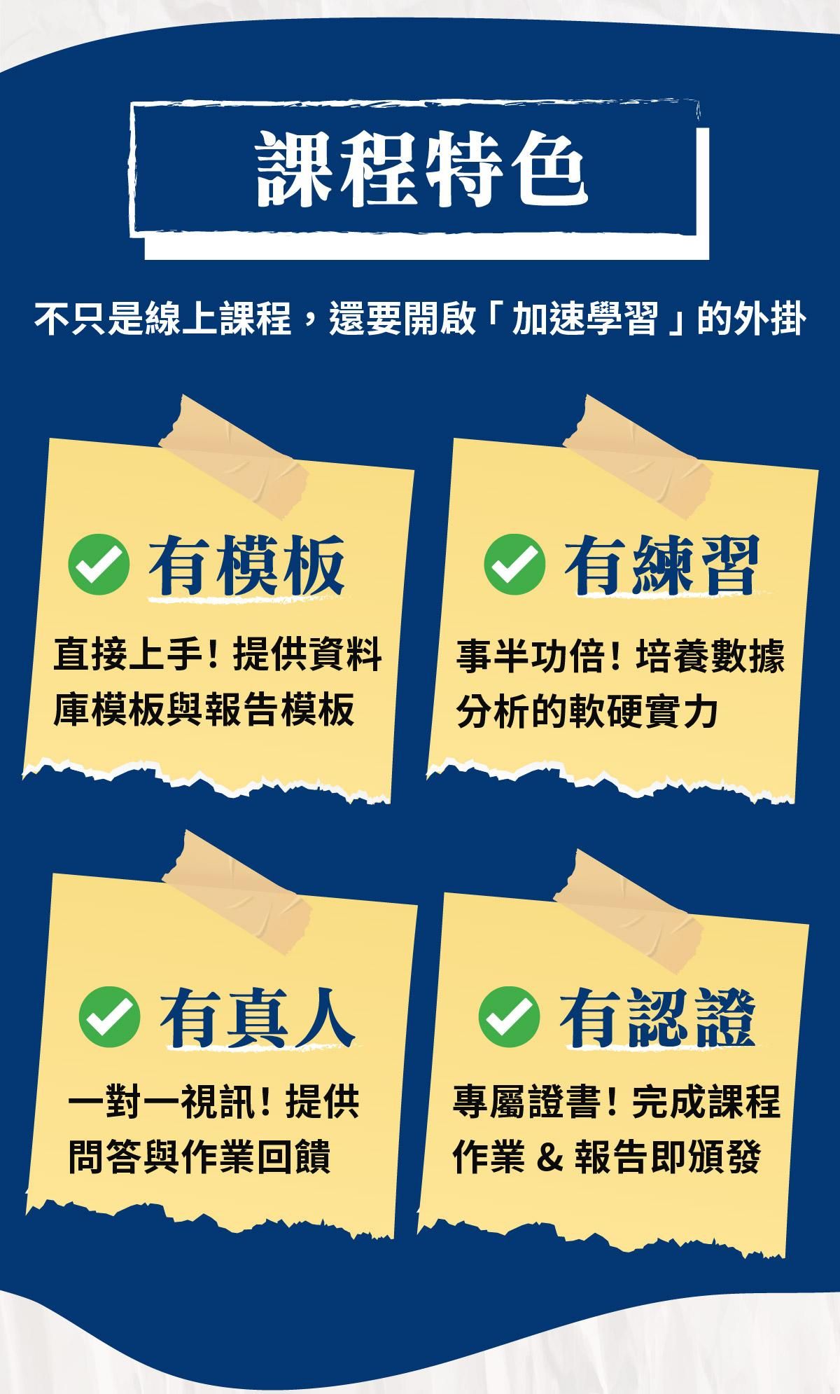 - 直接提供 Excel 模板,從資料庫到分析到報表,一站式學會