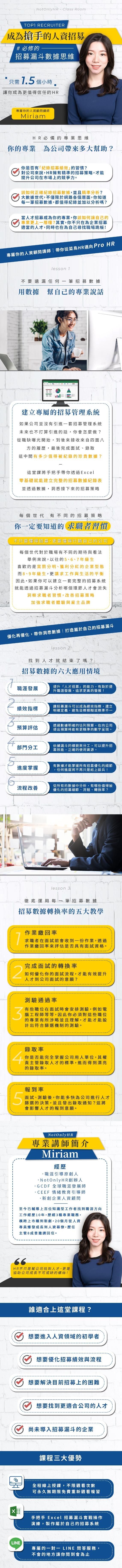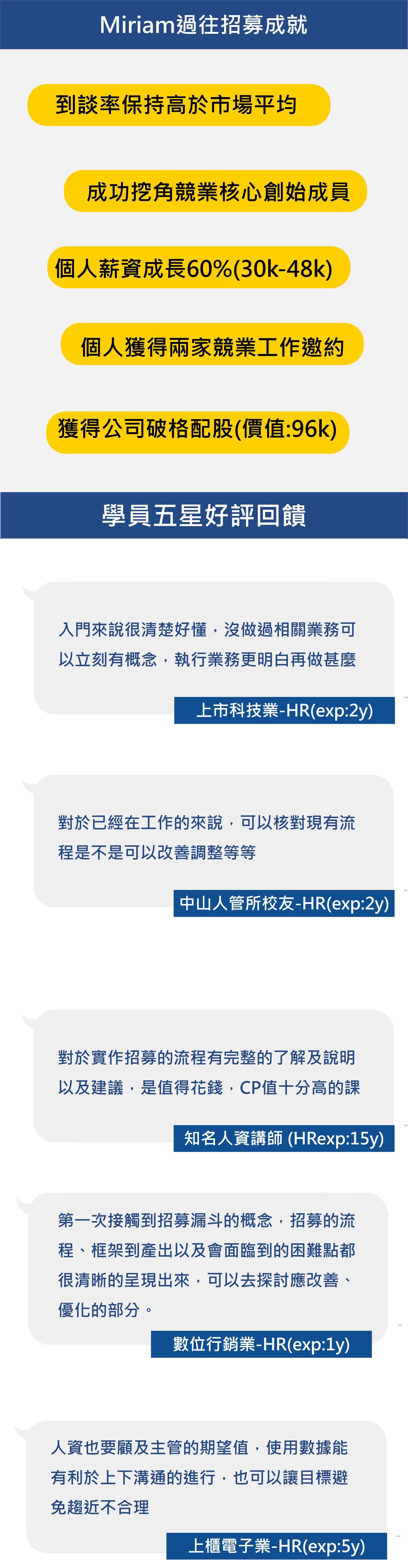 che06XX : 雖然我沒有要成為一個人資,但身為求職者,了解人資的邏輯對我在求職有很大的幫助,也讓我知道怎麼優化我的履歷跟面試談吐。謝謝Miriam ~