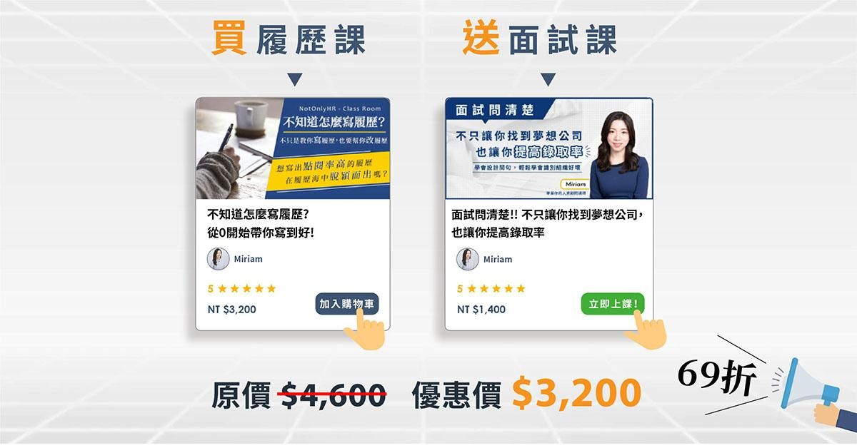 - 直播講座結束會有折扣優惠 “買履歷課送面試課 原價 4600 優惠價 3200 (69折)"